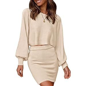 MEROKEETY Women’s Puff Sleeve 2 Piece Knit Outfits Solid Color Crop Top Bodycon Skirt Set Sweater