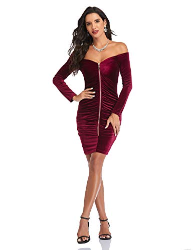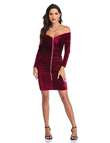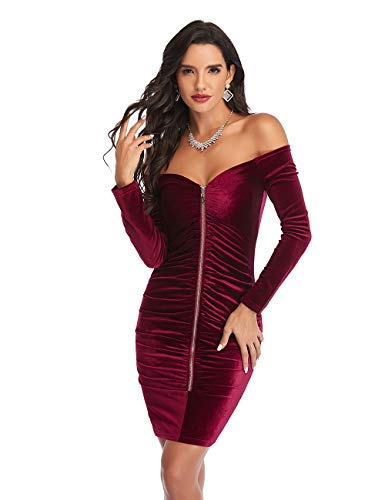 Atnlewhi Womens Off Shoulder Long Sleeve Dress Zip Front Ruched Stretchy Velvet Bodycon Cocktail Club Dresses Wine Red