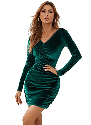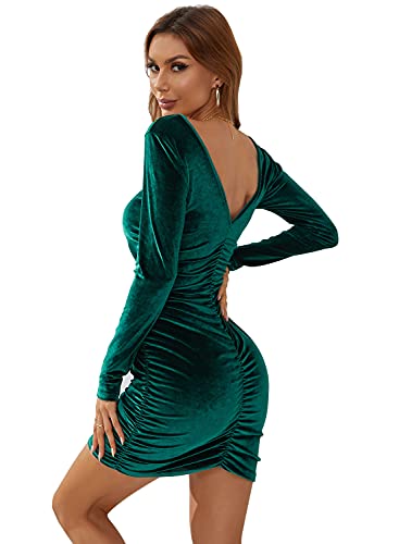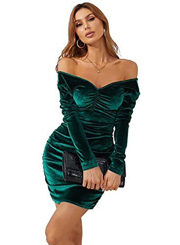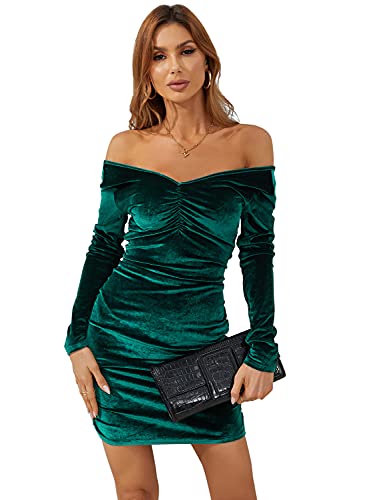 Atnlewhi Womens V Neck Off Shoulder Velvet Long Sleeve Stretchy Bodycon Ruched Winter Cocktail Party Club Dresses Deep Green