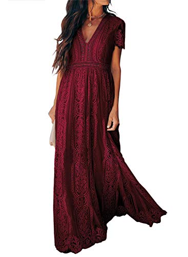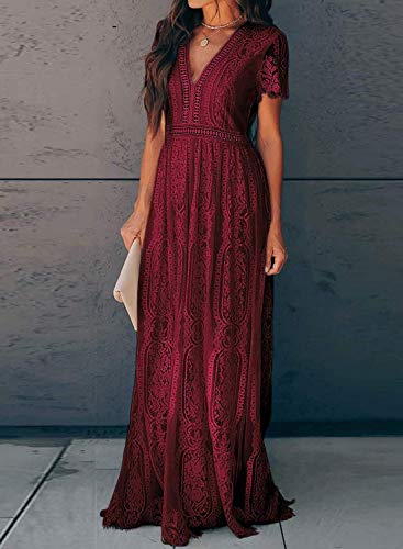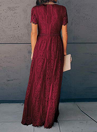 AZOKOE Women Deep V Neck Short Sleeve Floral Lace Bridesmaid Maxi Dress Wedding Cocktail Party Gown Wine Red S