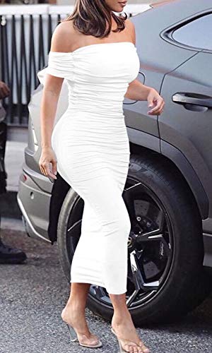 Style:off the shoulder and ruffles, we design a ruffle below the shoulders to make the dress elegant and sexy.the ruched midi dress can give people a layered look,the half back make you more attractive while promise not too exposed.