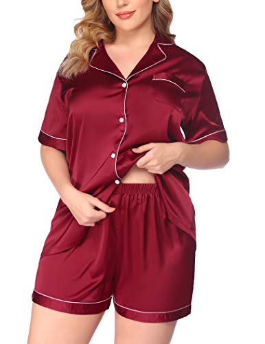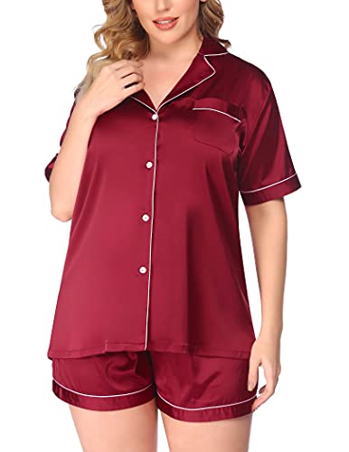 IN’VOLAND Women’s Plus Size Pajama Set Short Sleeve Sleepwear Satin Nightwear Loungewear Sets with Pocket Wine Red