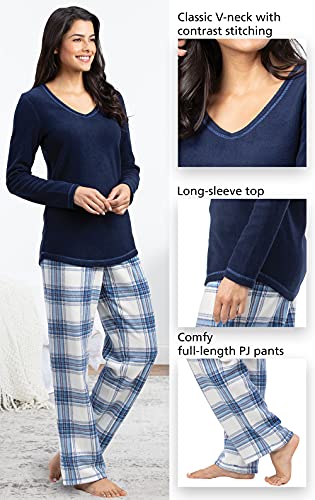 Two-Piece Fleece PJ Set – Choose from two styles: Straight-leg pant and long-sleeve v-neck top with contrast stitching; Or jogger style pant with front pockets and relaxed fit crew neck top with straight banded hem and drawstring. Both styles flatter and feel fantastic!