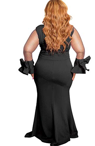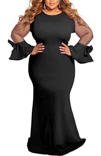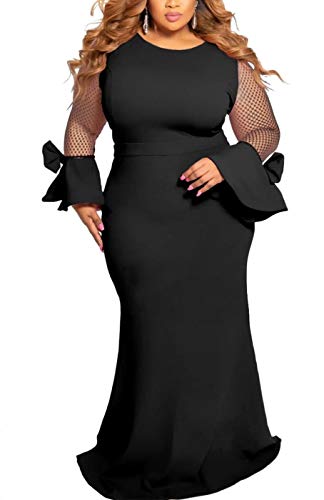 Features: plus size, long sleeve, round neck, solid color, mesh patchwork, trumpet long sleeve, bow tie, vintage, oversized dress for plus size women ladies, floor length faishtail long maxi dress plus size,formal dress for special occasions, sheer mesh plus szie dress