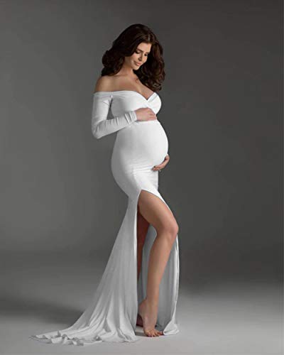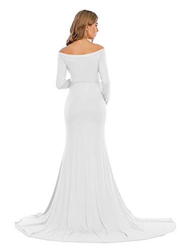 ZIUMUDY Elegant Fitted Maternity Gown Side Split Off Shoulder Long Sleeve Maxi Photography Dress Baby Shower (White, Small)
